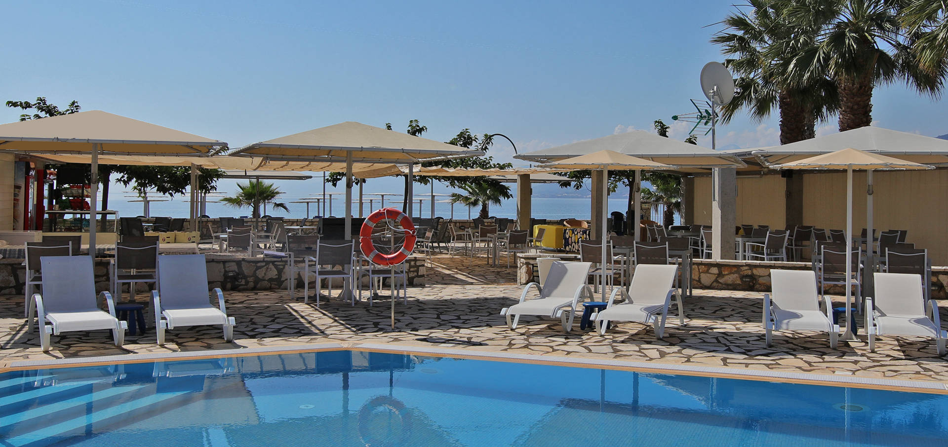 Hotel bieten viel Platz. Liegen und Sonnenschirme am Strand laden zum
